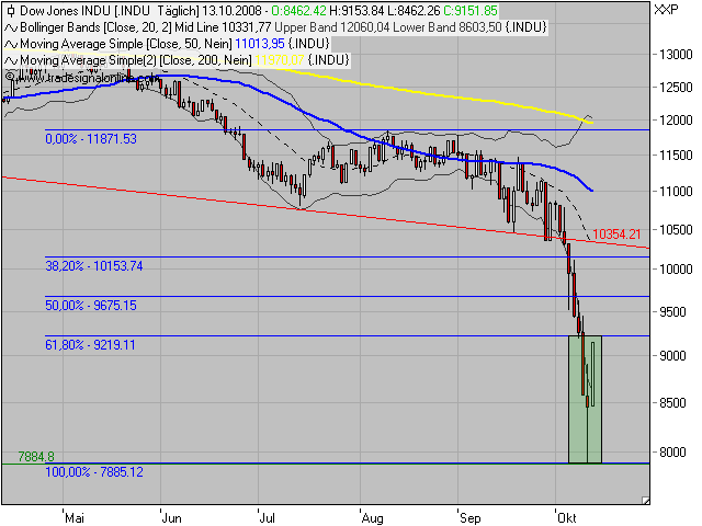 Danke für den Retracement-Chart. Danach habe ich gesucht! Vermutlich wird es spätestens bei Dow 9700 zur Korrektur kommen, das 61,80%-Retracement wurde soeben punktgenau erreicht, aber das ist noch zu schwach.