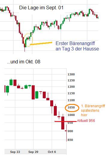 Im Chart unten sieht man, wie im Sept. 01 der erste Shortangriff am dritten Tag erfolgt. Damals erfolglos, doch heute sind die Kurse deutlicher gestiegen als damals, daher könnten die Bären heute mehr Erfolg haben.