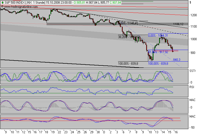 Trotzdem werden wir erstmal einen Boden bilden. Dabei ist ein noch etwas deutlicheres Tief als letzte Woche möglich, aber nicht wesentlich tiefer. Ob es nach der Bodenbildung wieder für einige Zeit aufwärts geht, hängt von der Sicht auf die wirtschaftliche Lage ab. Ist die noch nicht abschätzbar, werden wir steigen. Sieht der Ausblick gesichert düster aus, werden wir im Nachhinein feststellen, dass der Boden nur ein Palier auf dem Weg in den Keller war.