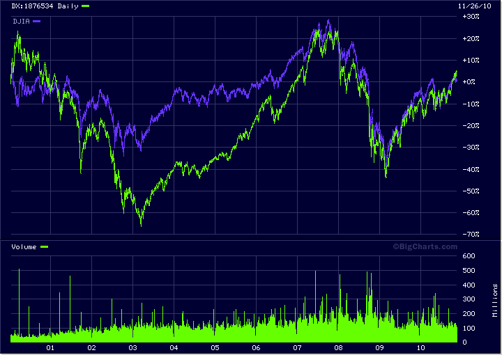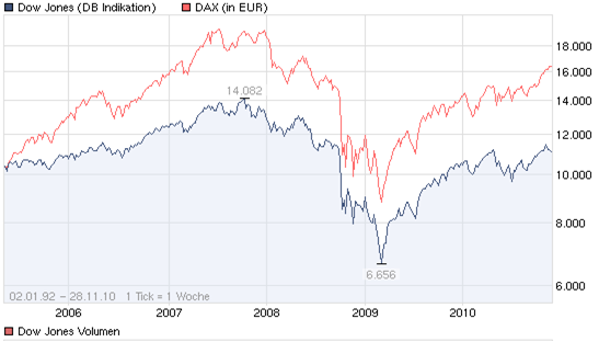 Oder für den Intellektuellen: Wenn D's Kunde USA konjunkturtechnisch nicht in die Puschen kommt, dann ist das nicht gerade positiv für die weitere Entwicklung in D. Der Trader von heute weiß das und drüclt den Dax schonmal auf Verdacht. Ergebnis: Dax und Dow treffen sich wieder irgendwann, zumindest relativ. Langfristig kann der Dax durchaus den Dow outperformen, so geschehen Ende der 90er.