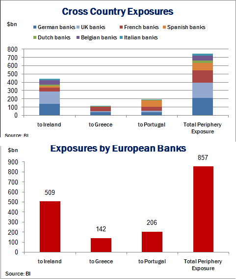 Kurzfristig gesehen wird sich aber diese "Show" weiterführen. Die Bereitschaft mit der die anderen Staaten in der Eurozone Ireland aus der Schuldenkrise verhalfen kann leicht erklärt werden. Die "Exposure" von EU Banken zu Irland, Griechenland und Portugal (lese "PIG") ist massiv, 857 Mrd $, mit Spitzenreiter die deutschen Banken mit einer von über 200 Mrd $ Exposure. Das totale Ausmass kann man an der Grafik unten erkennen.