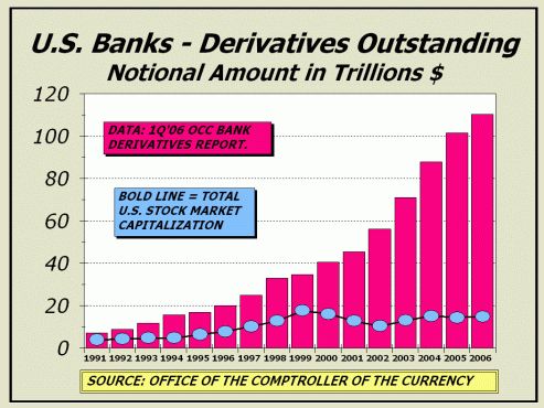 Chart dazu: Er ist nicht mehr ganz aktuell, da das Derivate-Volumen inzwischen auf rund 135 Billionen (engl. Trillions) gestiegen ist. Zum Vergleich: Die angeblich überbordenden Devisen-Reserven Chinas belaufen sich auf lediglich 1 Billion Dollar. Das ist weniger als 1 Prozent davon!