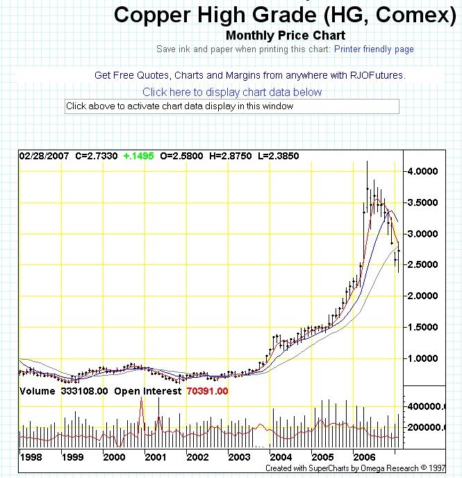 Der jüngste Kurssturz beim Gold läuft erneut parallel zu dem in Edel- und Industriemetallen wie Kupfer, Zink, Silber u. a.. Der drastische Preisverfall bei Kupfer (Chart unten) und Zink führte im Januar zur "Abwicklung" des Londoner Hedgefonds "Red Kite", der mit Futures "long" Industriemetalle war. Dadurch geriet auch Goldman Sachs' Riesen-Hedgefond "Global Alpha", der stark an Red Kite beteiligt ist, in Schwierigkeiten (Details: # 57 und 58 in diesem Thread). Nicht umsonst hat die Kreditbonität von GS seitdem stark gelitten.