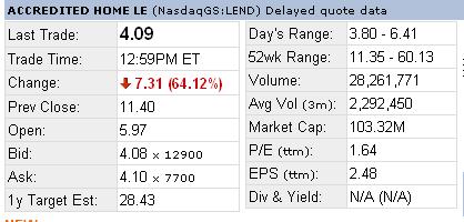 ...Die Papiere des Hypothekenfinanzierers Accredited Home Lenders Holding brechen um 64% auf 4,12 USD ein, nachdem das Unternehmen Liquiditätsprobleme eingeräumt hatte. Im übrigen Finanzsektor sinken Citigroup um 1,8% auf 49,35 USD. Die Investmentbank hat ihr Übernahmeangebot für die japanische Nikko Cordial aufgestockt. Goldman Sachs, die zunächst von dem überzeugenden Quartalsbericht der Bank profitiert hatten, verlieren nun 0,6% auf 201,32 USD. Die großen Investmentbanken sind wichtige Geldgeber der Immobilienfinanzierer. ...