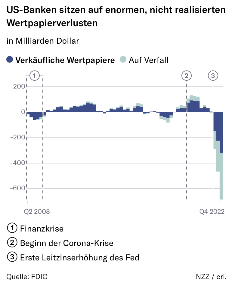 Hinter der letzten Bankpleite verbirgt sich eine strukturelle Entwicklung, die das gesamte amerikanische Finanzwesen betrifft: Vor allem kleinere und mittelgrosse Banken hatten ihre Bilanzen in der Vergangenheit mit niedrig verzinsten Anleihen überladen, die nun aufgrund der aggressiven Zinsstrategie des Federal Reserve zur Inflationsbekämpfung buchtechnisch im Minus liegen und die sie im Notfall nicht auf die Schnelle verkaufen können, ohne Verluste zu machen.
