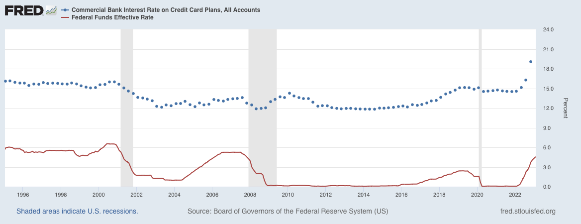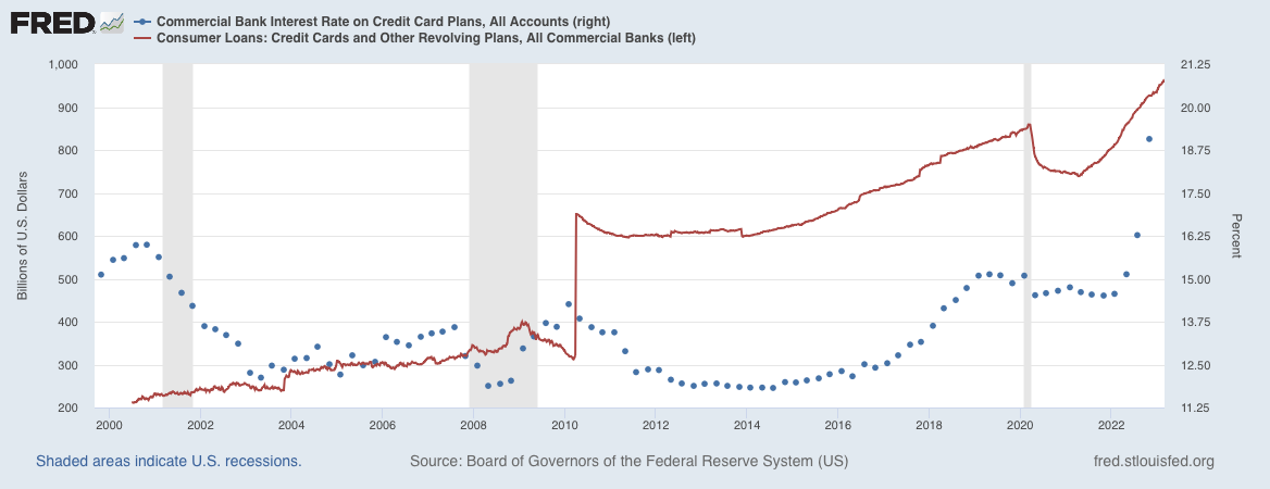 Sollte die FED weiter an der Zinsschraube drehen oder einfach nur den aktuellen Zins belassen, geht mehr kaputt, wie nur eine Bank in Kalifornien. Wir sind im Endspiel - siehe den exponentiellen Verlauf des durchschnittlichen Zinses für Kreditkartenschulden.
