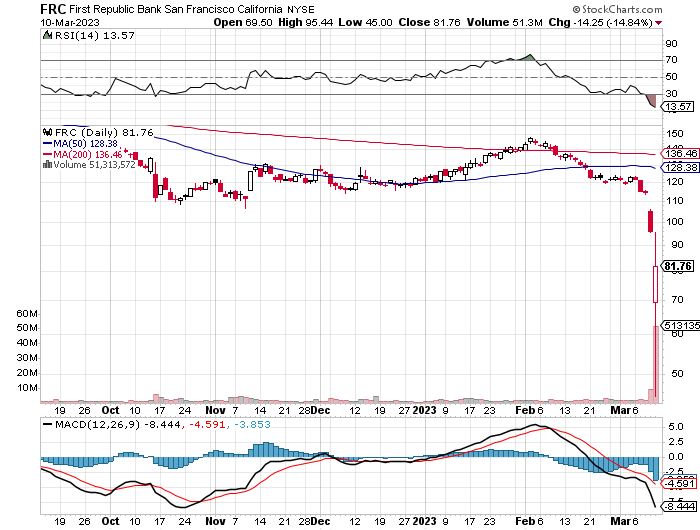 Es gibt andere Wackelkandidaten wie die First Republic Bank (FCR) in San Francisco, deren Aktie am Freitag mit 50 % Minus eröffnete, am Ende des Handelszeit jedoch mit -20 % schloss (Chart in # 083). Ansteckungseffekte können daher gerade bei kleineren Banken mit hohen Anleihenbeständen sehr wohl auftreten.