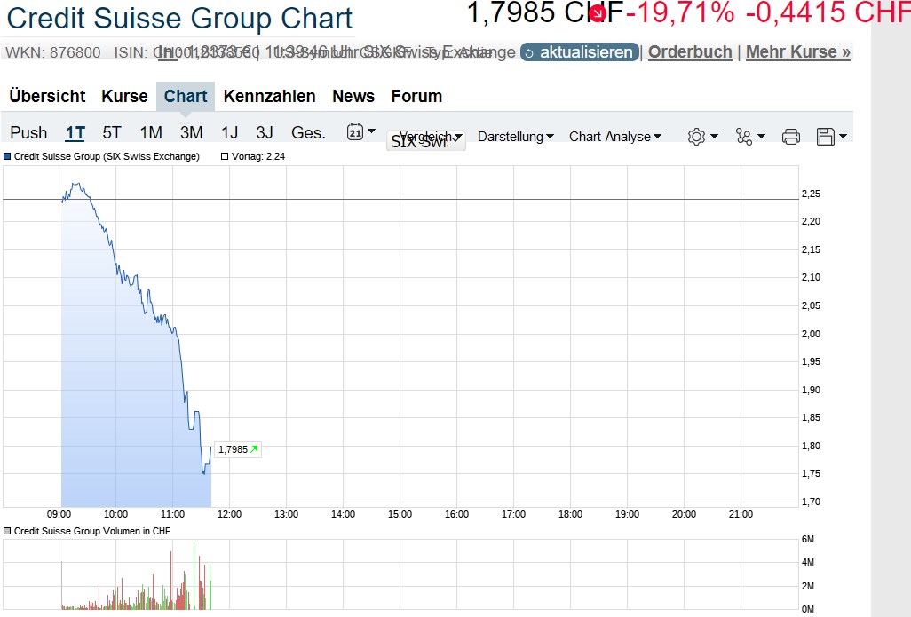 die cs aktie taumelt richtung 2 franken, jetzt wirds langsam richtig ernst. der grossaktionär aus saudi arabien hat heute weitere hilfen ausgeschlossen, also bliebe als letzte stütze nur noch die snb.