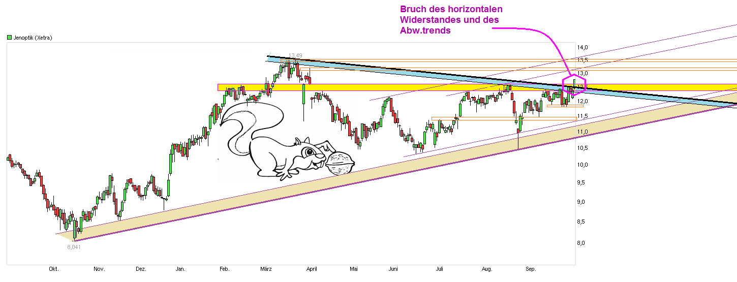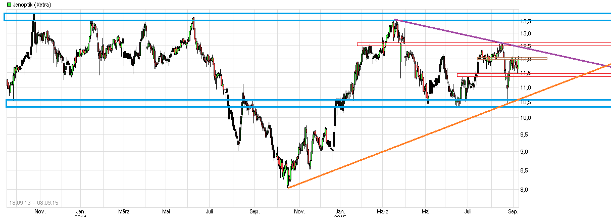 Heute könnte zumindest die Warterei vielleicht erstmal vorbei sein was ein SK über 12,05 angeht. Aber da läge mit der Region von ca. 12,50/60 und dem seit März fallenden Abw.trend auch schon wieder zwei potenzielle Bemsklötze nicht weit entfernt von den aktuellen 12,28€. Die Halbjahreszahlen waren ja besser als mancher dachte und auch der Ausblick für das 2.Hj.15 war vielversprechend. ( =>http://www.ariva.de/news/...uechern-und-kraeftigem-Gewinnplus-5454196 "...Jenoptik haben vor allem gut laufende Geschäfte mit Energie- und Sensorsystemen im zweiten Quartal ein deutliches Gewinnplus beschert. Hinzu kommt ein dickes Auftragspolster, so dass Unternehmenschef Michael Mertin am Dienstag in einer Telefonkonferenz von einer guten Basis für die Jahresziele sprach. Mit überproportionalen Zuwächsen rechnet der Vorstand in den Regionen Amerika und Asien.Dabei stimmen ihn vor allem eine anziehende Nachfrage aus der Automobilindustrie zuversichtlich. Mittlerweile setzt Jenoptik ein Drittel des Konzernumsatzes in diesen beiden Regionen um..." ). Ist halt die Frage wie sich die Auftragsbücher in 2016 füllen werden, da man ja u.a. auch im Automobilbereich tätig ist (der unter schwächerer Nachfrage in China/Asien leiden könnte) und man auch mit Asien direkte Kundenbeziehungen hat. Von daher mal schauen, ob man bei den Q.3 Zahlen schon etwas zu hören bekommt, ob Jenoptik da irgendwelche Vorzeichen sieht, daß sich etwas abkühlt. Ansonsten sind aber natürlich so Aufträge wie jüngstens von der US Marine oder die Bahntechnik-Aufträge für Österreich/Polen/Tschechien positiv zu sehen, da sowas eher unabhängig ist von konjunkturellen Dingen in Asien