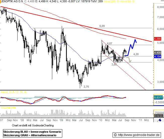 Oberhalb dessen bleibt die Aktie auch mit den aktuellen Kursrückgängen mittelfristig bullisch, wobei der nächste markante Widerstand bei 4,87 Euro und dann bei ca. 5,25 Euro auszumachen ist.