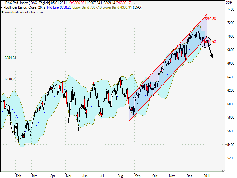 Nun noch zum Dax. Beim Dax sieht es charttechnisch nicht sehr rosig aus. Ist vom mittelfristigen Aufwärtstrend nach unten abgerutscht und auch die Bollingerbänder sehen nach einem Ausbruch aus (da sie sehr eng beisammen sind.) Es könnte durchaus möglich sein, dass die Korrektur bis in den Bereich von 6650 Punkten geht. Doch noch ist noch nichtts entschieden, warten wir den heutigen Tag mal noch ab, vielleicht geschieht noch ein Wunder :):)