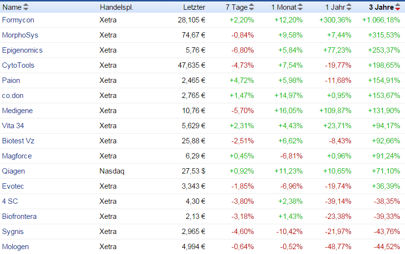 Hier mal die Performance der deutschen Biotechwerte sortiert genau nach einem Jahr. Was sind denn eure Topperformer bis zum Jahresende. Ich denke mal Formycon und Medigene werden weiter konsolidieren. Sygnis dürfte wieder starten, da sehr wahrscheinlich keine Kapitalmaßnahme mehr nötig ist. Cytotools und Epigenomics dürften bei positiven Bescheiden wohl zu den Topperformern geören. Vielleicht noch Magforce nach einer möglichen Kapitalmaßnahme. Ich denke mal die anderen dürften in etwa mit dem Trend schwanken.