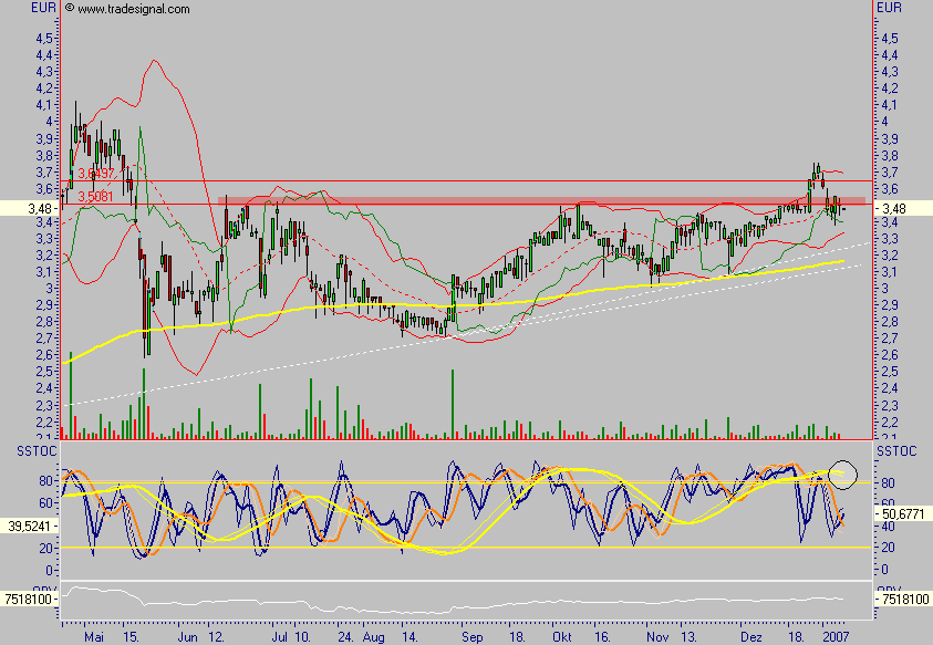 obwohl die Charttechnik tatsächlich etwas negativ erscheint, jedoch solange wir auf dem aktuellen Niveau verharren, passiert nichts, unter 3,40/3,45 wäre schlecht. Rechne eher im Zusammenhang mit den Zahlen für Q4 mit einer Überraschung (Zitat Finanzvorstand "Wir sind SEHR zufreiden mit 2006) und einem weiteren Schub bis zumindest knapp unter 4 Euro