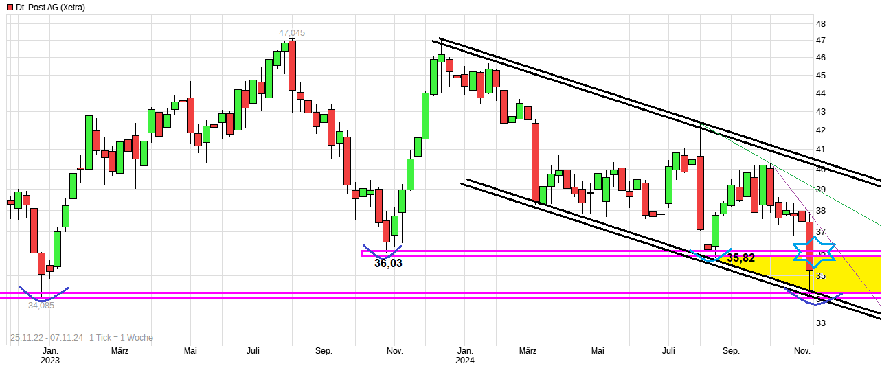 Die Aussage wurde gestern dann auch zügig bestätigt. Man fiel gestern bis 34,11€, d.h. kam sehr eng bis zur horizontalen Unterstützung vom November 2022 (34,08€). Dort setzte wieder Gegenbewegung ein. Allerdings dürfte jetzt auf der Oberseite die alte Unterstützung im Bereich 35,82/36,03€ nun erstmal zu einem Widerstand geworden. Da könnte also die jetzige Erholung schon wieder an Grenzen kommen bzw. es eventuell nur bei einem Pullback dann bleiben. Ein erstes Stärke-Zeichen wäre es erst wieder sich über diesem Bereich zu etablieren. In wieweit die politischen Unsicherheiten/ Änderungen (US Wahl / Ampel-Aus) auch eine Rolle spielen in der nächsten Zeit kann ich nicht abschätzen. Von daher schaue ich hier erstmal weiter nur auf die Dinge die der Chart an Signalen aufzeigt.