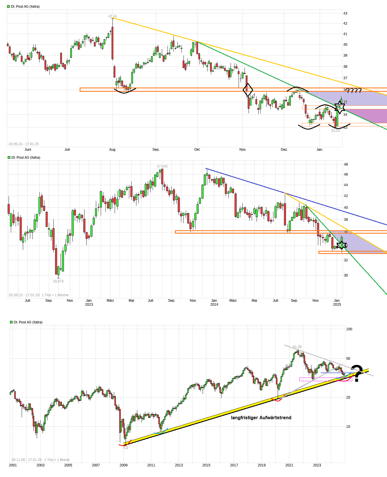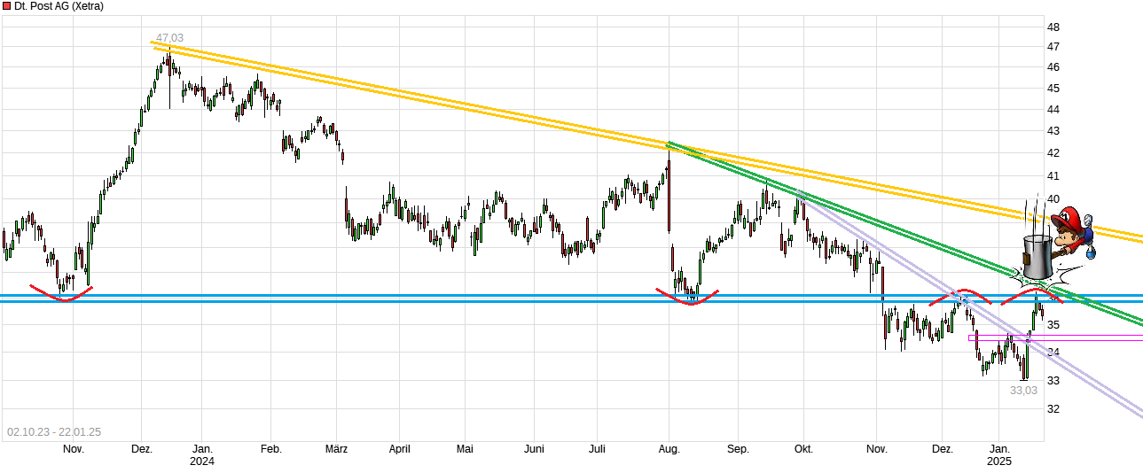 Aktuell notiert man ja erst einmal weiter ganz leicht über 36€. Von daher tanzt man auf der Widerstandsmarke rum ohne echte Entscheidung. Zumindest ist die Gesamtbörse trotz des gestrigen dicken Nvidia-Dips wieder zurück in Feierlaune und DAX steht wieder nur wenige Punkte entfernt von einem neuen Allzeithoch. Wenn die Post wieder nachhaltig sich über der 36er Marke bewegen soll, dann wäre es sicherlich noch leichter bei einem festen Börsenumfeld als in einem Schlachtfeld. Etwas medial störend sind momentan vielleicht die Tarifverhandlungen und die Warnstreiks. ( https://www.ariva.de/news/...er-post-verzoegert-zustellungen-11516232 ). Die dritte Verhandlungsrunde ist für den 12. und 13. Februar angesetzt. Zieht sich also hin. Man kann sicherlich bessere Gewinnprognosen für 2025 abgeben, wenn man auf der Kostenseite genauer absieht wie die Lohnkosten sich entwickeln. Aber vielleicht denkt mancher Vermögensverwalter auch wieder zunehmend etwas antizyklisch. Man sieht ja schnell wie überbewertete Tech-Highflyer die Biege machen können. Vielleicht geht da mancher Investor jetzt auch mal wieder schauen was an gefallenen Engeln da im Tal liegt, wo die Rückschlaggefahr inzwischen eher überschaubar aussieht. Also von mir aus darf es gerne nordwärts gehen und so mancher Widerstand und Abw.trend dabei noch überwunden werden.