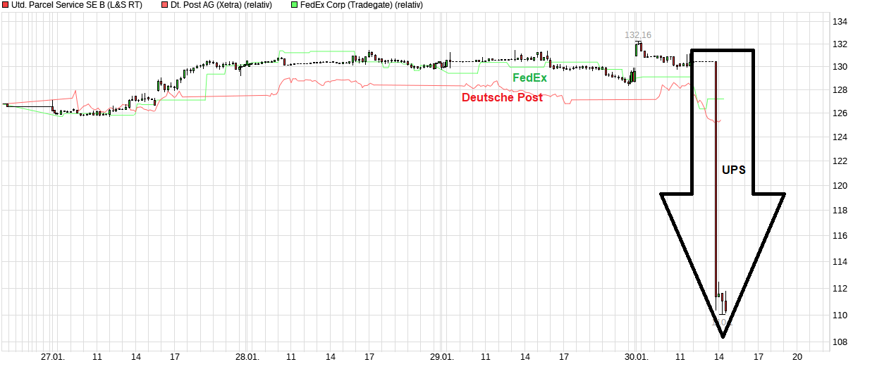 Die Meldung von UPS hat natürlich die Stimmung der gesamten Branche ab dem Mittag heute mitbelastet und die Aktie der Deutschen Post wieder klar unter 36€ gedrückt. Auch wenn das Geschäftsfeld von UPS nicht 1:1 dem von DHL/Deutsche Post entspricht, so sind eventuell solche Probleme anderer Zusteller doch u.U. schon eine gewisse Vorwarnung, daß auch bei der Deutschen Post gewisse Dinge noch nicht wieder in allen Sparten so rund laufen wie sie sollten bzw. die Belebung des Geschäfts etwas weniger dynamisch in diesem Jahr zu erwarten ist wie mancher Anleger vielleicht hofft. Wie gestern schon gepostet, es fehlen gegenwärtig neben starken neuen Chartsignalen auch erst einmal weiter kursanschiebende "good news", sei es von den Peers oder eben von der Deutschen Post selber. Von daher warten bis die Post selber mal etwas zum eigenen Geschäft wieder sagt.