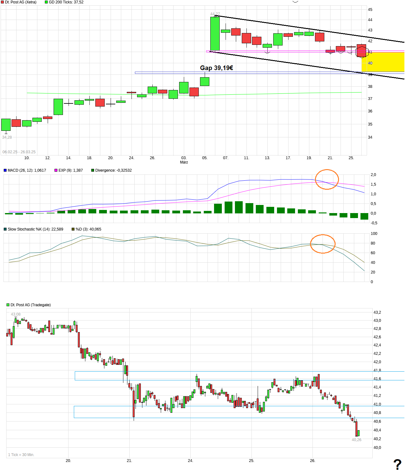 Die Märkte geben heute nach der Rede von Trump deutlich nach. Die Post-Aktie jetzt bei 37,80€. Mal schauen wie es die nächste Zeit hier weitergeht und ob man der Unterstützung um 36€ noch näher kommen wird. Irgendwie hat der Gesamtmarkt aber auch einen an der Klatsche. Da ist seit vielen Tagen bekannt gewesen, daß Trump am 2. April in seiner Rede die große Zollkeule rausholen wird. Und dann rennt der DAX in den drei Tagen davor um 600 Punkte hoch bis zum Top gestern als wäre man taub und blind oder würde meinen Trump hätte vergessen was er wollte. Und nun heult man rum und tut man so als hätte das keiner ahnen können. Börse ist eben nicht der Hort der reinen Logik ;)
