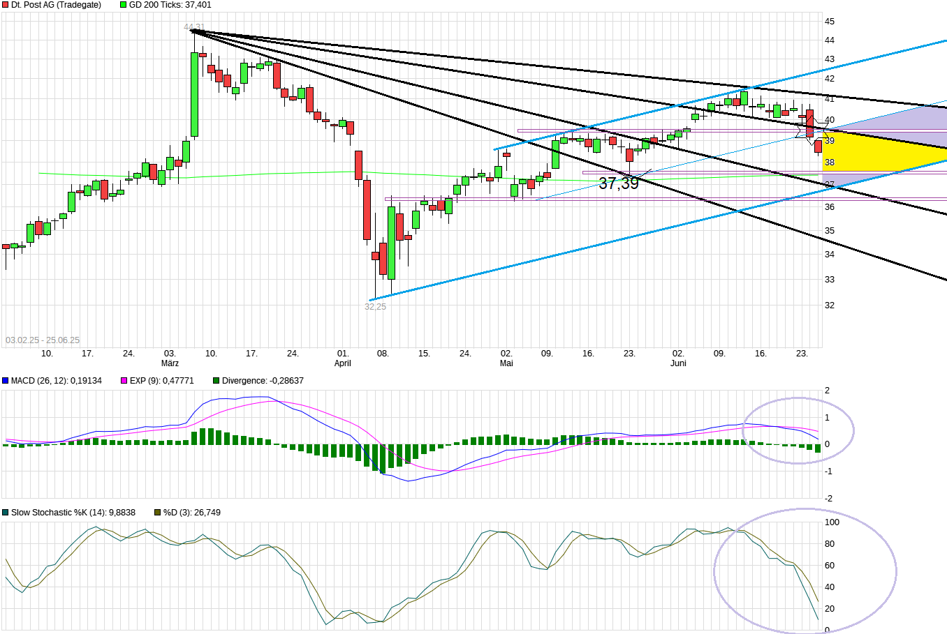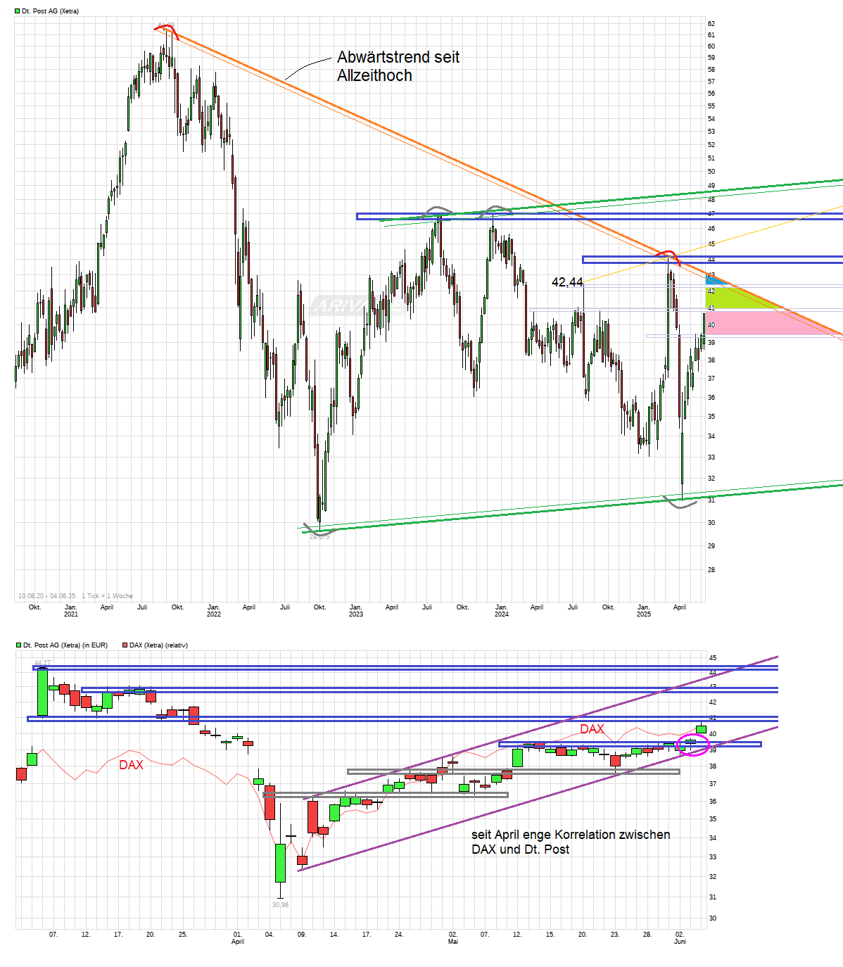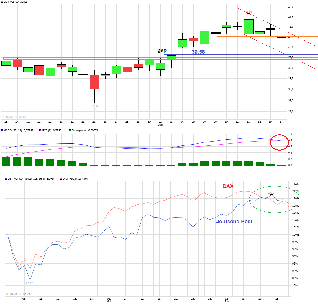Gegenwärtig korrigiert der Gesamtmarkt wie auch die Aktie der Deutschen Post. Von daher schon zumindest Gleichschritt in der Richtung. Aber es muß ja nicht unbedingt wieder im gleichen Umfang weiter ablaufen. Es stünde jetzt z.B. noch das offene Gap bei 39,58€ im Raum. Sollte der DAX die nächsten Tage bzw. Richtung großer Verfallstag am Freitag noch weiter nachgeben, dann wäre das z.B. ein mögliches Anlaufziel. Man darf nicht vergessen, daß der DAX seit dem Tief von Anfang April in kurzer Zeit brutal nach oben explodiert ist um krasse 6000 Punkte Anstieg. Davon wurde bislang nur magere 1000 Punkte wieder abgegeben. Ist also bislang eine noch immer sehr moderate Gegenbewegung auf den vorherigen Monsteranstieg. Wäre daher auch nicht so ganz verwunderlich, wenn auch noch etwas mehr Korrektur käme. Der S&P500 notiert mit einem KGV von ca. 22 . Das langjährige Mittel liegt bei ca. 17. Somit haben die US Märkte objektiv betrachtet eine inzwischen schon eher unattraktiv Bewertung und es dürfen halt keine "Störungen" kommen die diese "heile Welt" ankratzen. Das aktuell wieder mal stattfindende "Geplänkel" im nahen Osten darf man nicht überbewerten dabei. Das hat man jedes Jahr 2 bis 3 mal und das seit Jahrzehnten. Sehe den Grund für die allgemeine Korrektur eher in der deutlichen Überkauftheit nach dem starken Anstieg seit April. Da muß eben auch mal zwischendurch "durchgeatmet" werden. Von daher mal schauen wie man mit Trump nun durch den Sommer kommt ohne neue Zoll-Eskapaden.