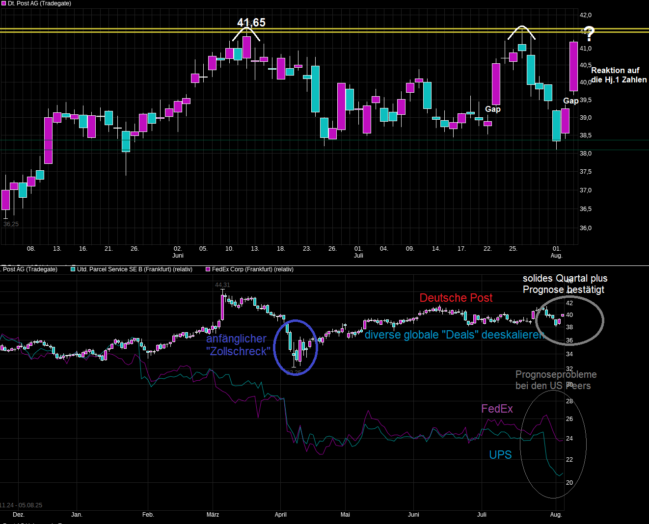 Tja scheint als wären die Sorgen für die Branche wirklich wieder etwas geringer, wo sich die ganzen Zoll-Deals jetzt einstellen und auch nach Japan die EU bald eine Lösung finden sollte. Gleichzeitig sieht man in den USA weiter eine brummende Wirtschaft und die Börsen laufen von Allzeithoch zu Allzeithoch. Nachdem FedEx Ende Juni zwar ein gutes Quartal ablieferte, gleichzeitig erhöhte Risiken für das zweite Hj. sah (wg. der Zoll-Debatte =>25. Juni 2025, : FedEx überzeugt mit Zahlen, aber der Ausblick lässt die Aktie sinken - https://www.ariva.de/aktien/...entlicht-fedex-ueberzeugt-mit-11674298 ), knickte die Post Aktie anschließend solidarisch mit ein. Aber man sieht ja selbst bei der FedEx Aktie, daß es dort schon längst wieder Erholung gibt. Also Entwarnung? Entsprechend zieht auch die Post Aktie mit an. Vielleicht hat man ähnlich wie FedEx durchaus ein gutes Quartal gehabt, kann aber anders als FedEx gleichzeitig für das weitere Hj.2 die Prognosen bestätigen, da das Zoll-Theater inzwischen nach den ganzen Entschärfungen durch "Deals" keine wirklichen nennenswerte Auswirkungen haben sollte und die Weltwirtschaft ja trotzdem noch weiter brummt und Frachten um die Erde kreisen.