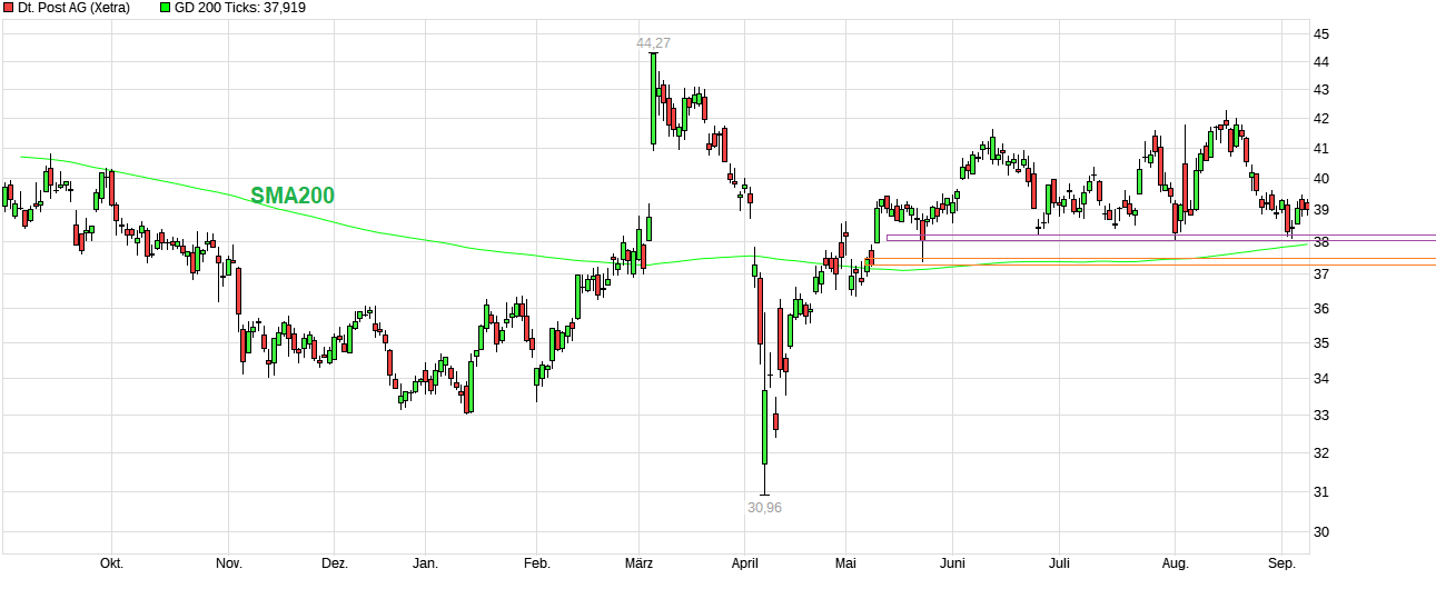Heute kommt es bei einem festen Gesamtmarkt zum nächsten Versuch die Widerstandsregion 41,60/70€ zu überwinden. Sieht aktuell noch gut aus. Sollte dies gelingen, dann läge der nächste horizontale Widerstand im Bereich von ca. 43,10/30€. Das Ganze wird natürlich auch aktuell wieder angetrieben durch die Gesamtbörse. Man bleibt damit erst einmal weiter seiner Rolle als Marketperformer gerecht. Dow Jones ist gestern wenige Punkte unter einem neuen ATH aus dem Markt gegangen und der DAX war heute früh auch schon wieder nahe an das bisherigen Allzeithoch hochgelaufen. Schon eher ungewöhnlich im August so starke Börsen zu haben. Wäre natürlich für die Post-Aktie wichtig, daß dieser "Rückenwind" vom Gesamtmarkt noch etwas erhalten bleibt.