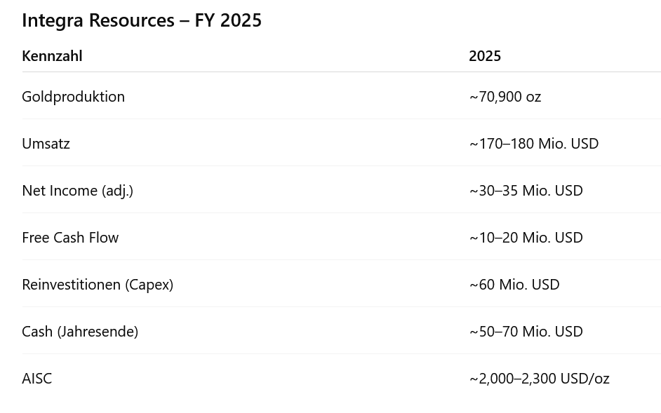 Integra Resources Zahlen 2025 Integra liefert mit Florida Canyon stabilen Cashflow und hat den Übergang zum Produzente­n geschafft – das ist die halbe Miete. Gleichzeit­ig sind die Kosten hoch und ein grosser Teil des Cashflows geht direkt wieder in die Mine zurück. Der echte Hebel liegt bei DeLamar – ohne das bleibt es ein kleiner, teurer Producer, mit Erfolg dort kann es zur echten Growth-Sto­ry werden.