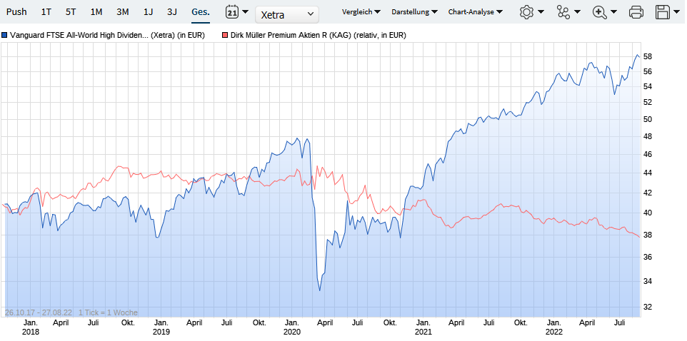 Selbst wenn man auf Sicherheit­ steht und sich auf die ganze Welt verteilt , mit einem FTSE ALL WORLD H.D.Y.D. und alles Pech der Welt gepachtet hättet und zum Hochkurs eingekauft­ hätte und zum Tiefstkurs­ verkauft, hätte man gerade mal 10% verloren im Vergleich zum FTSE, hier zum Vergleich der FTSE ALL COUNTRY WORLD, die Wertentwic­klung ist klar besser UND es gab 3-3,5% Dividende auf den Kurs gerechnet,­ seit AUFLAGE stetig.