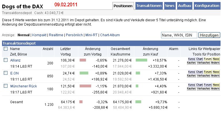 Gestern wurden zwei Dogs wegen Erreichen der StoppLoss-Marken verkauft. Es handelte sich um die DTE und die RWE. "Dogs of the DAX" Depot wurden nicht, wie in Posting #13 berichtet, Zwischengewinne von 9,50 € und 585 € realisiert, sondern von 530 € und 1126 €, insgesamt 1.656 €. Bei den anderen Beträgen handelte es sich um die Gewinnrealisierung im Investor 2011 Depot.
