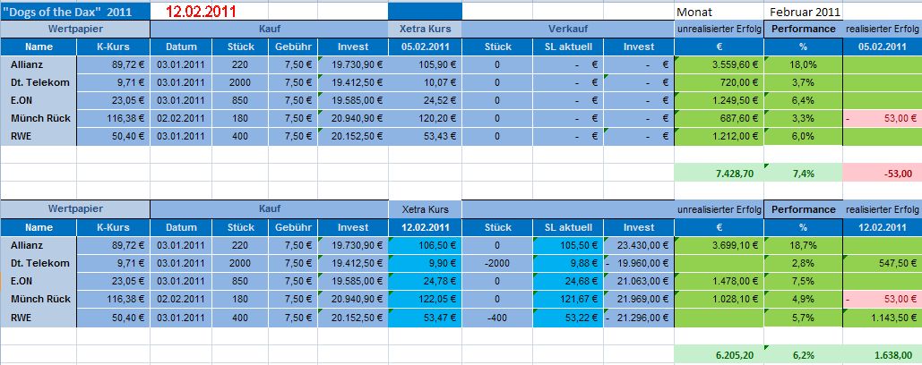 Die „Dogs“ legten weiterhin zu. Allerdings führten die Kursrutscher bei Deutsche Telekom und RWE am 10.02.2011 zum Verkauf, weil die StoppLoss-Marken erreicht bzw. unterschritten wurden. Zwar gab es interessante und kursfördernde Unternehmensnachrichten, doch der Kurs bröckelte im Verlauf der Woche weiter ab. Zwar berichtete das Unternehmen im Verlauf dieser restlichen Woche von der Zusammenarbeit mit SAP für die gemeinsame Entwicklung von Kunden-Software-Lösungen, ferner kündigte sie den Beginn einer Offensive im Bereich mobile Dienste und Produkte an und unterrichtete schließlich über die beabsichtigte technologische Kooperation mit dem französischen Telekommunikationskonzern France Telecom. Kursbewegend waren all diese Nachrichten bisher noch nicht. Es ist aber davon auszugehen, dass schon bald neue charttechnische Kaufsignale generiert werden.