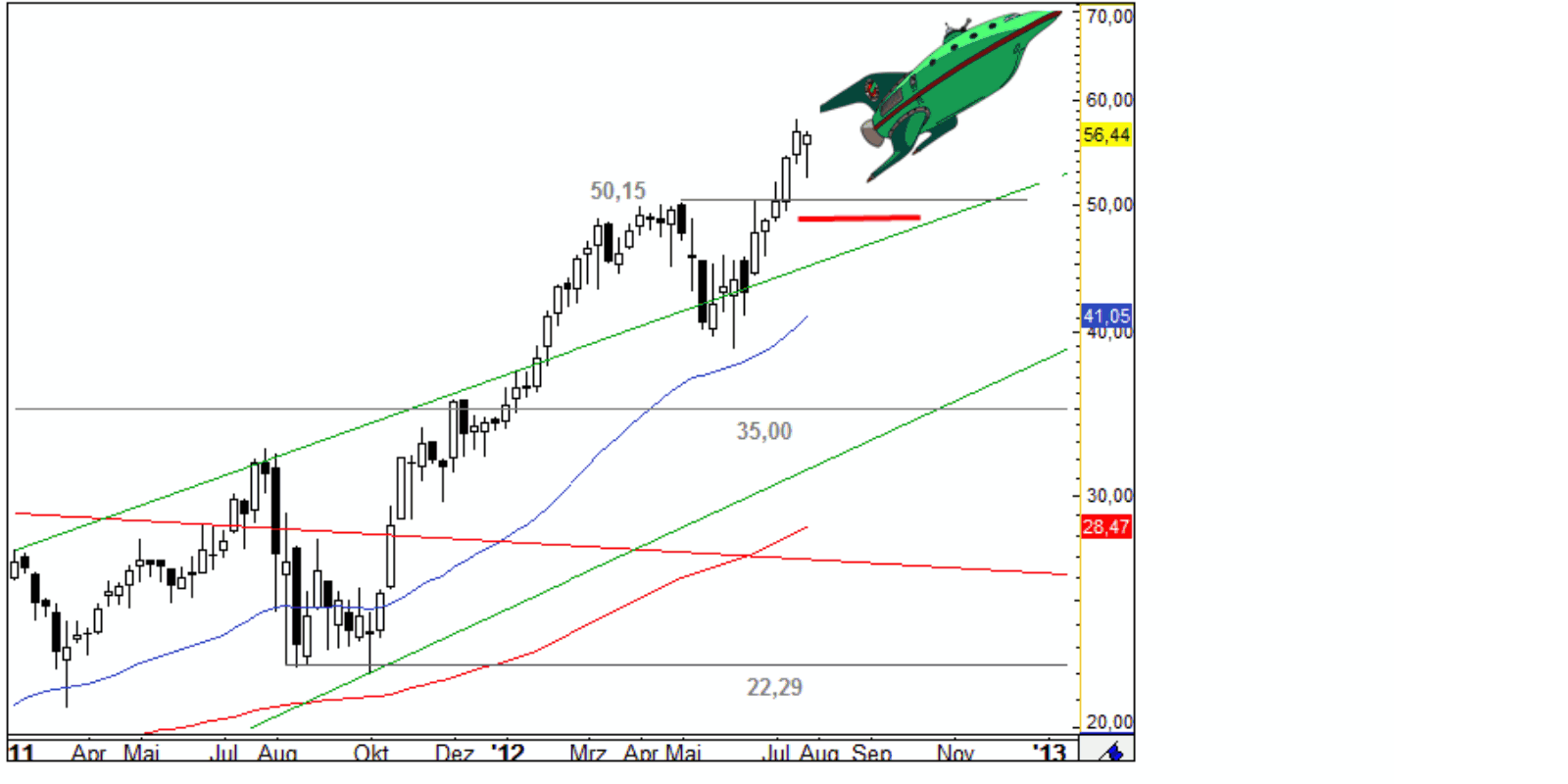 Somit setzt das Management die Prognose für 2012 erneut nach oben. Experten gehen davon aus, dass sich das Wachstum noch eine ganze Weile fortsetzen wird. Investierte Anleger bleiben daher weiter investiert und wer nicht dabei ist, setzt ein Limit bei 45 Euro. Rein fundamental gehen wir zwar nicht davon aus, dass dieser Kurs erreicht wird, neue Schockmeldungen aus der Eurozone können allerdings eine Verkaufswelle auslösen, die dann per Abstauberlimit genutzt werden kann.