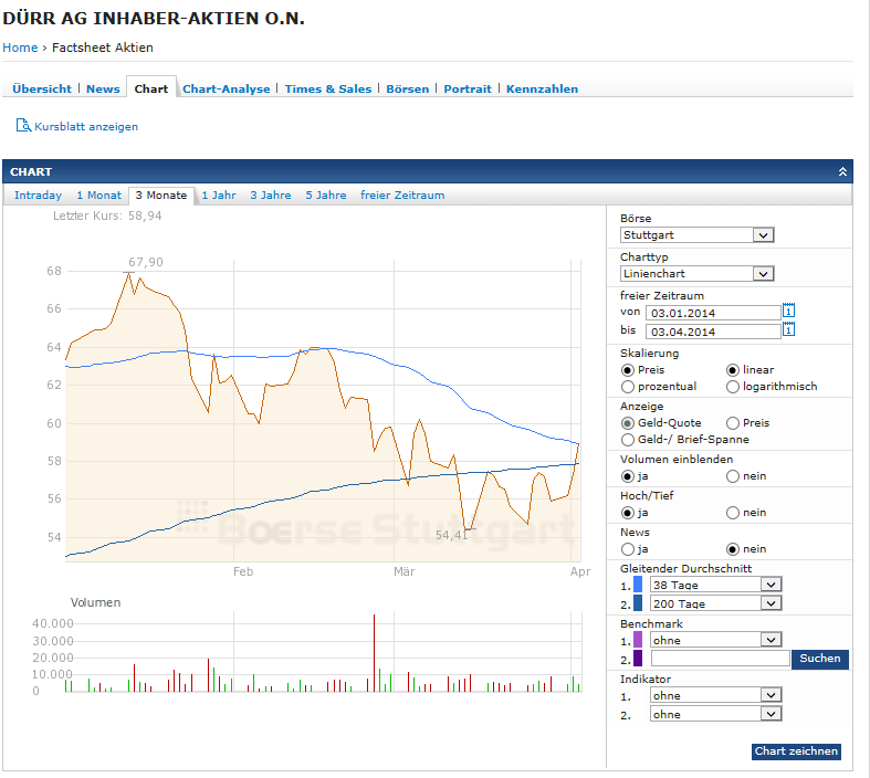 Meiner Meinung nach, ist Dürr bei irgendwo um die 50 rum nach der Krim- und sonstiges Krise bei irgendwelchen Weltaffen ein absoluter Kauf. 20% Ziel bei Aktien. 100% Zielkurs auf einem schicken Schein. Hat mich dazu verleitet, obwohl ich grade eher am Häusle bauen bin, trotzdem mal wieder 40k auf das Depot zu schieben. Ich warte nun auf ein Ende der Krimkrise und steige dann wieder ein. Aber erst wenn Gras über die Krim usw. gewachsen ist. Das ist dann wohl lange nicht mehr der mögliche Tiefststand aber dafür sollte das dann bei einer Dürr absolut save sein.