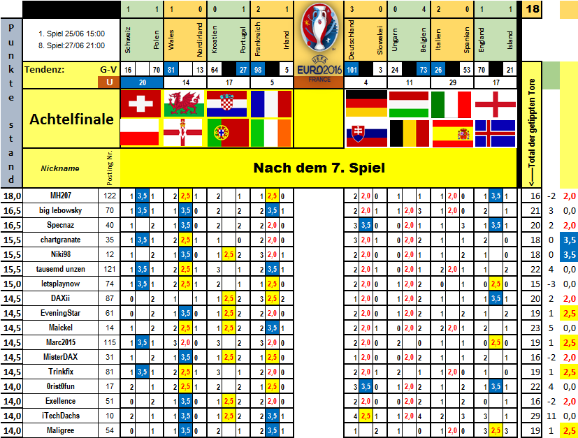 Weiter geht es nun mit dem Achtelfinale - das Achtelfinale läuft vom 25.06. bis zum 27.06. 2016!