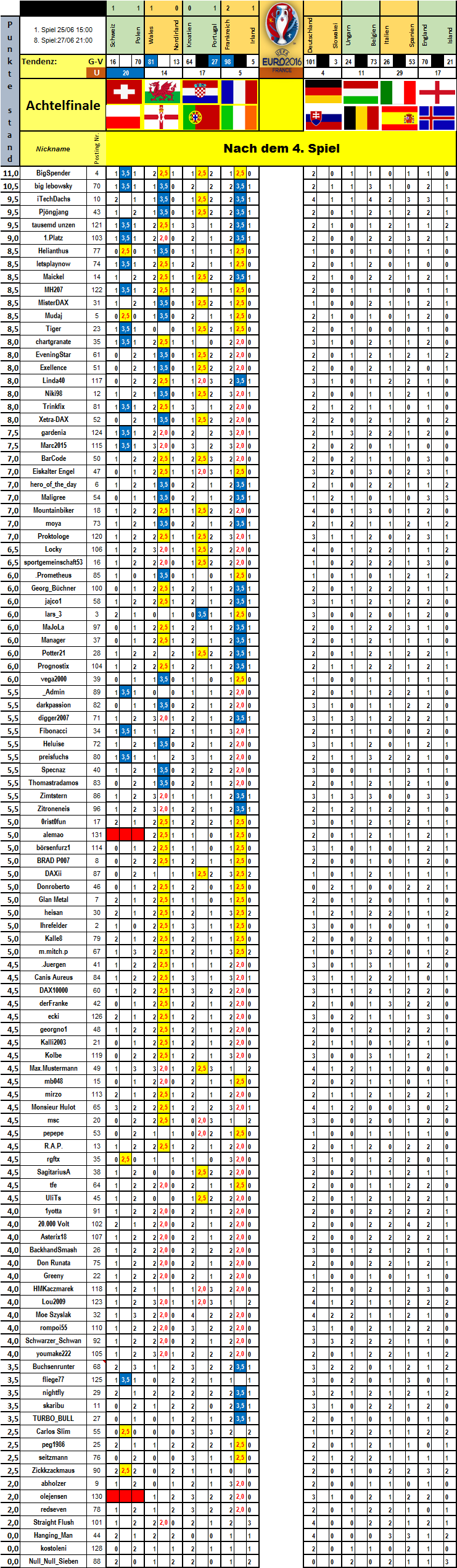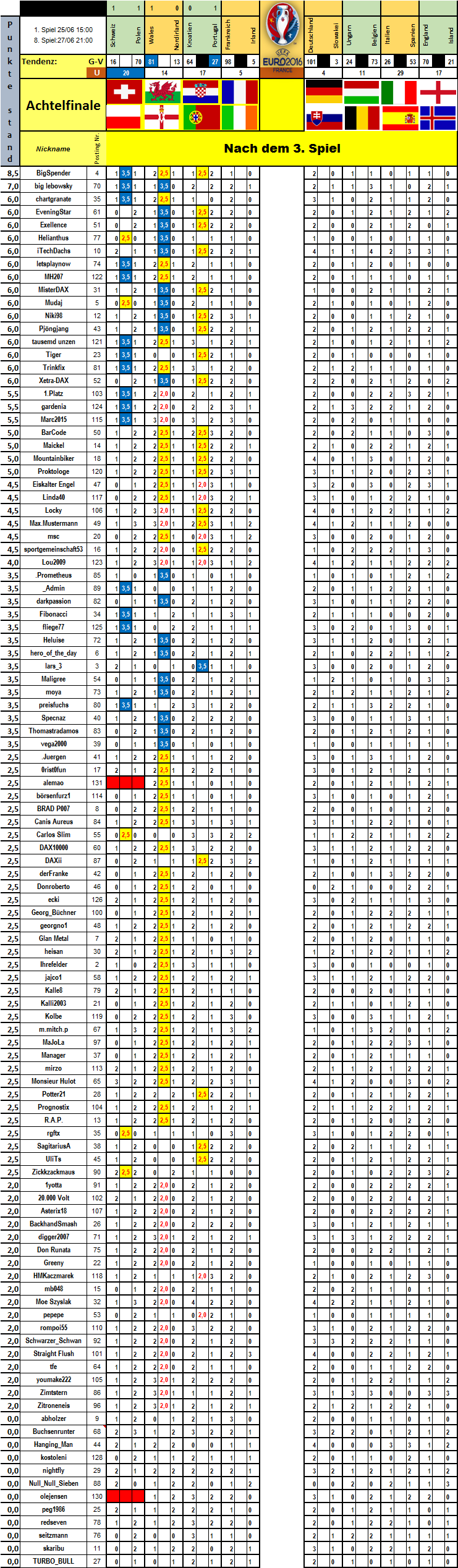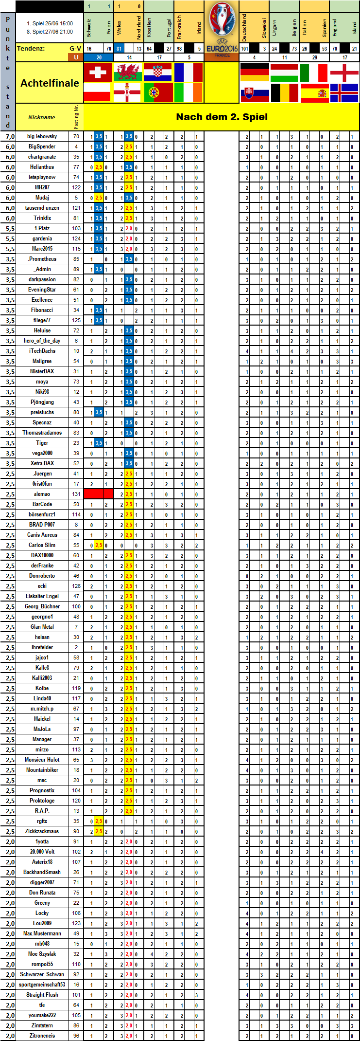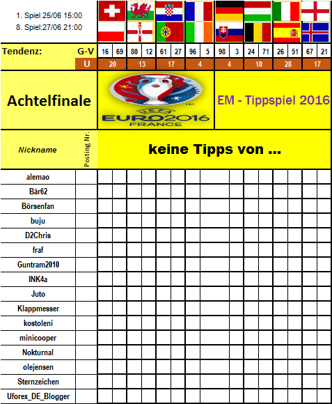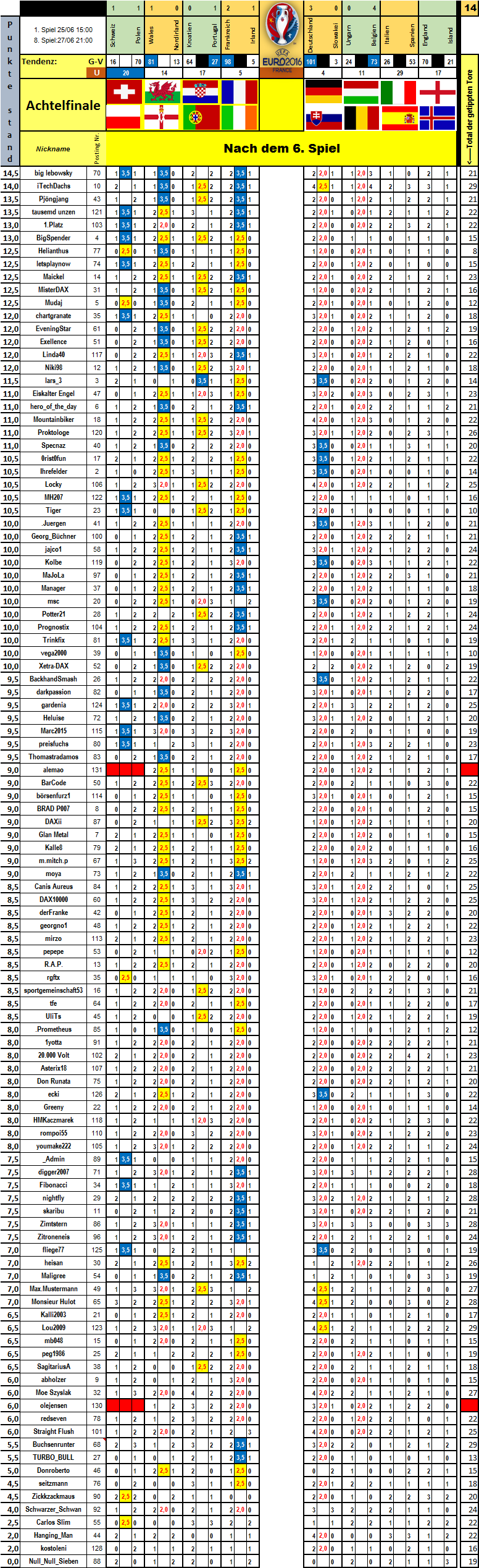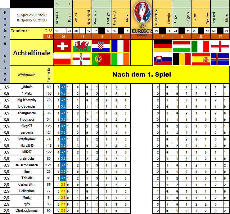Von den 6 Achtelfinalen hätte ich 5 mal richtig gelegen. Aber wer kann schon Not gegen Elend tippen. Zu Wales hatte ich keine Meinung.