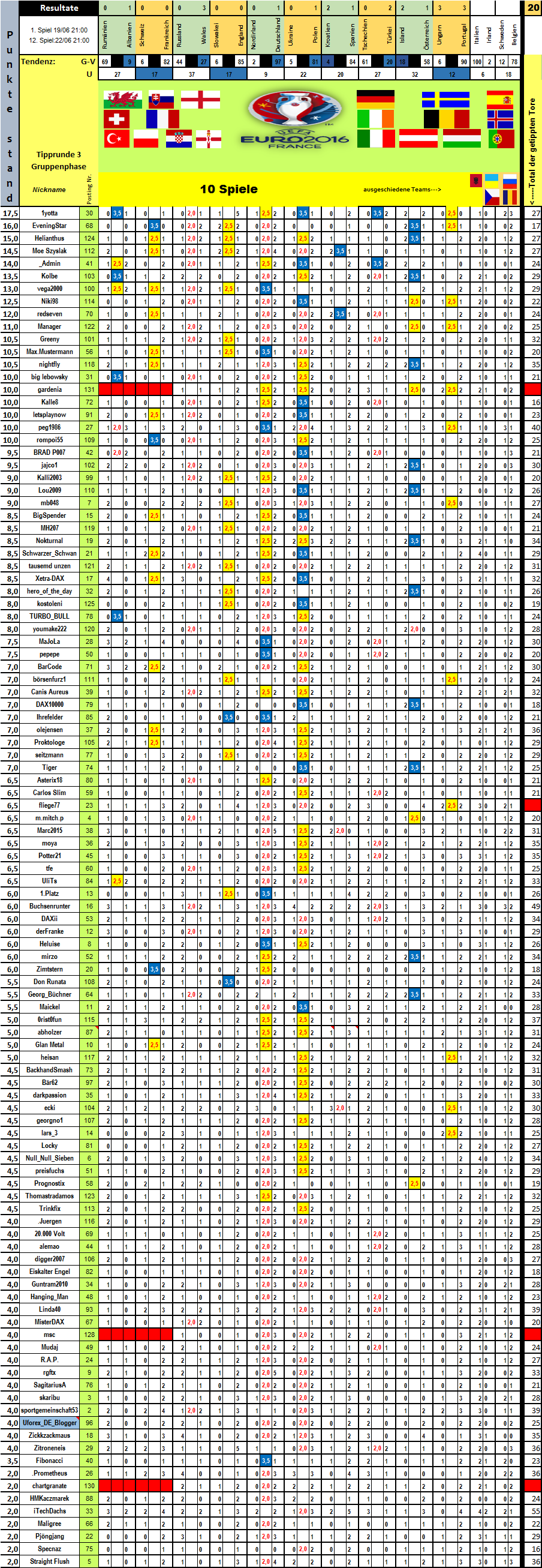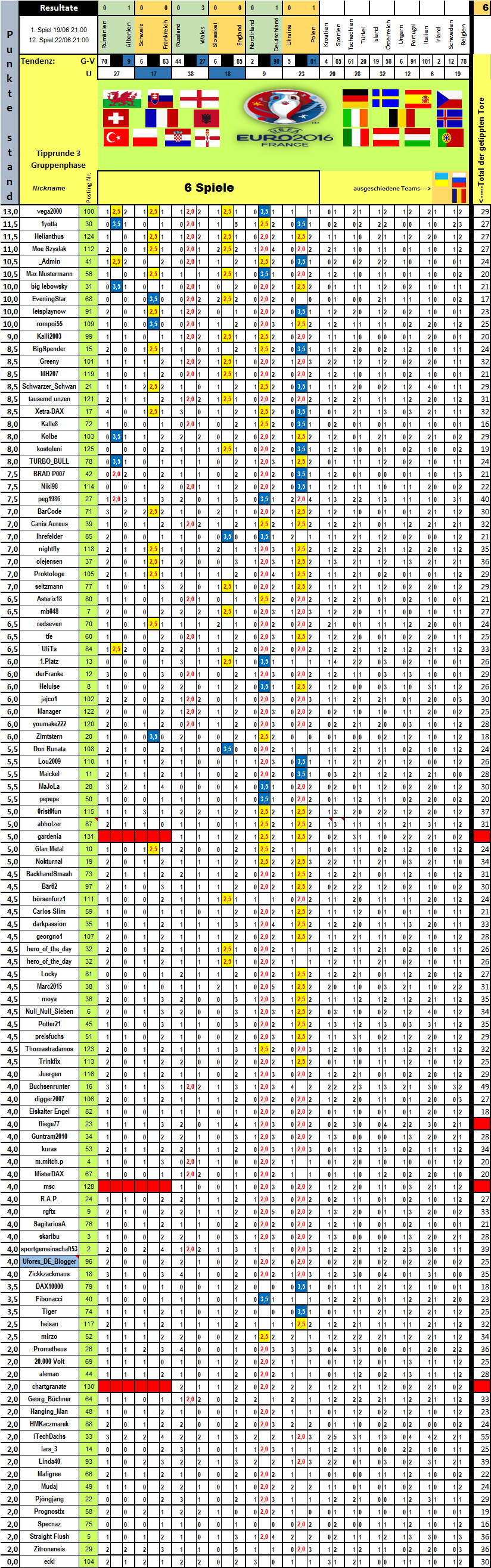 In deinem Fall, darf man deine Tippänderungen (hellblaue Markierungen) als nicht besonders vorteilhaft bezeichnen. Insgesamt war deine hohe Anzahl an Toren in den 12 Begegnungen (bei dieser EM- jedenfalls) wohl auch zu hoch geschätzt, sodass du wahrscheinlich nicht in den Genuss der Zusatzpunkte hättest kommen können, denn auch egal.