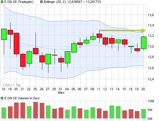 Wenn du die fette, grüne Kerze vom 08.03.2013 als neuen Außenstab definiertst, so ist das Close der aktuellen Woche über 13,27 sicherlich hilfreich, aber im Wochenchart nicht wirklich sexy. Hier wäre die Marke 13,50 von größerer Bedeutung. Immerhin sind die beiden Marken mit den wichtigen Marken im Daily-Chart identisch, dass könnte auf in der Tat zu großer Dynamik führen, wenn dessen Reißen gut getimed wird (z.B. am Freitag).