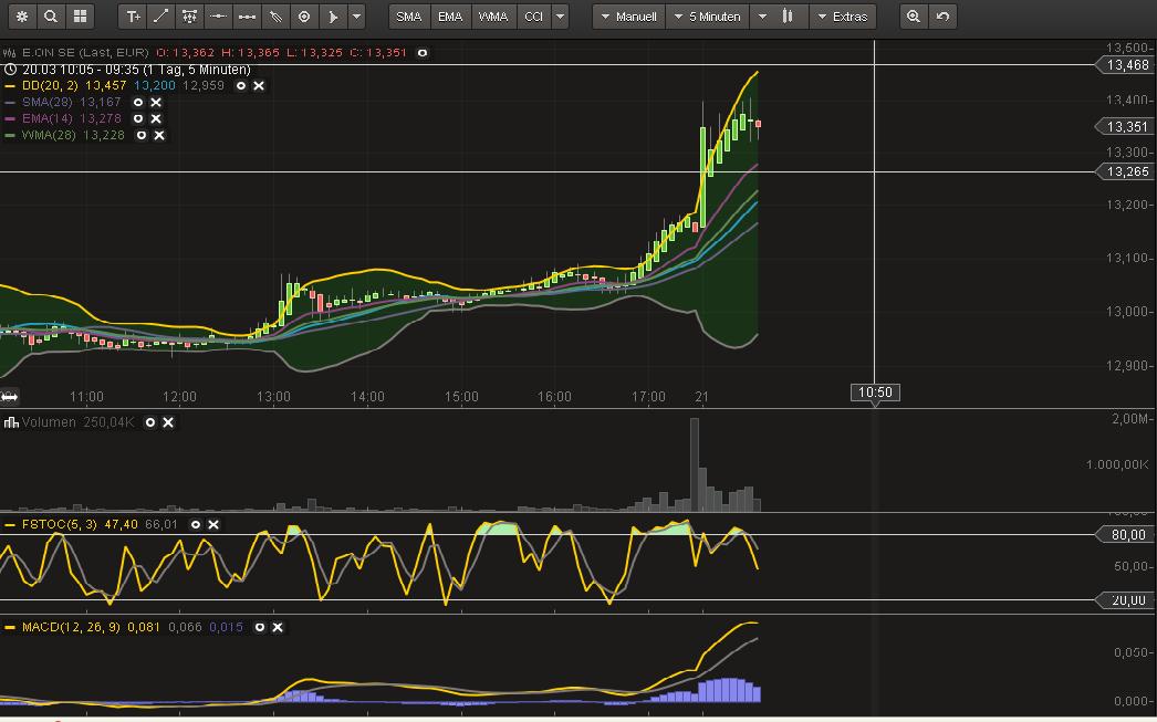 Ist mir aktuell zu wenig Dynamik drin. Wenn es nach dem überschreiten von 13,27 direkt zum Angriff auf 13,50 gekommen wäre, wäre es für mich die Wende. Aktuell sieht es danach aus, als ob ein paar Stopps von ängstlichen Shortis abgefischt werden.