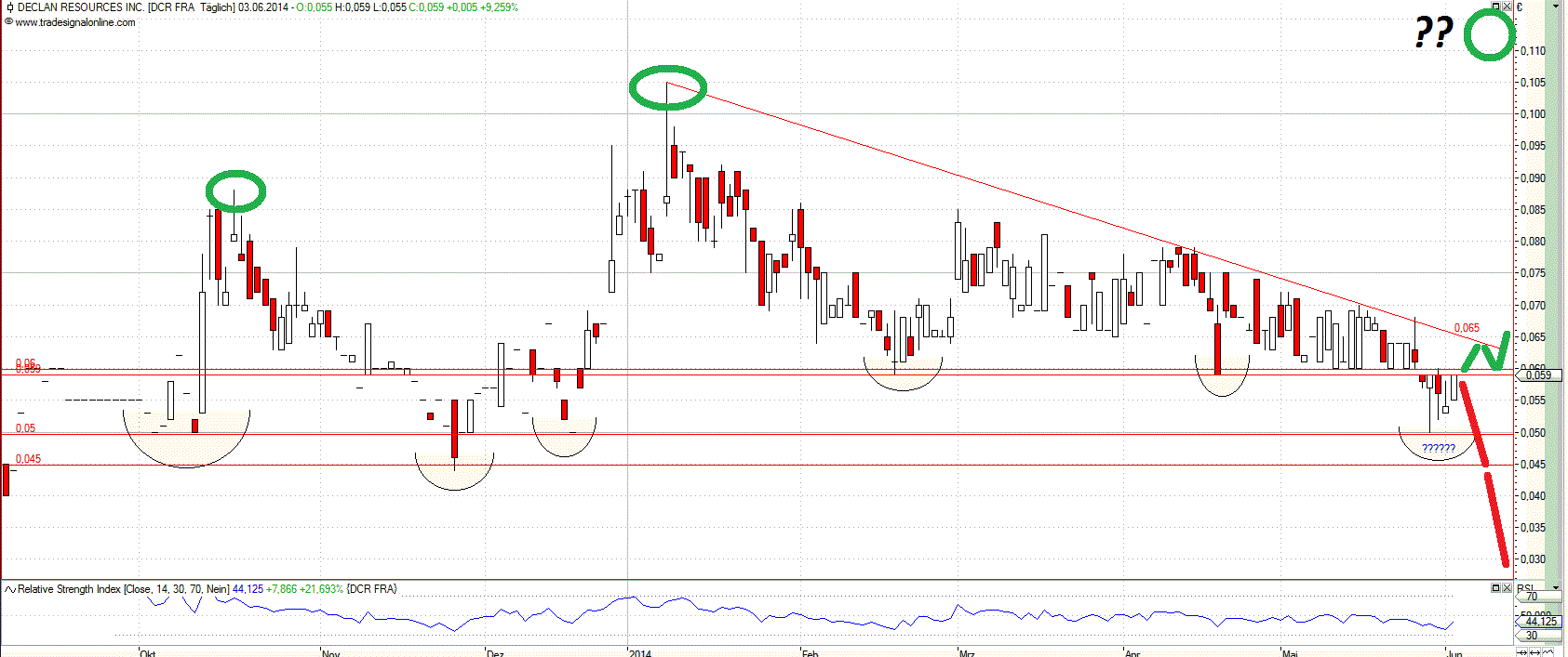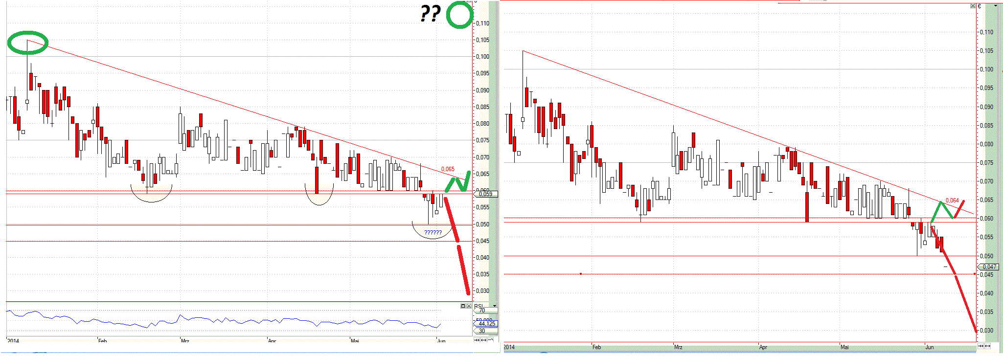 also bei so einer Aktie ist Charttechnik nicht alles und nicht wirklich leicht weil wir jeden Tag Sprünge von 7% oder mehr haben. Wenn du dir aber mal zb die Chart ansiehst dann kommt das doch immer ganz gut hin finde ich. Hier zb den Chart vom 3.06.2014 und der von heute dem 9.06.2014. Ich denke das ist der beste Beweis das Charttechnik sinn hat