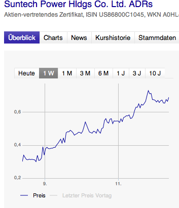 Der Bericht der Hongkong Economic Times, dass MidAmerican Energy an Suntech Power interessiert sei, elektrisierte die ADRs von Suntech Power die seit dem um knapp achtzig Prozent kletterten. Die Spekulationen um einen Einstieg eines Investors verdichteten sich, da das China Securities Journal mitteilte, dass ein Vertreter von Suntech Power sagte, das „Unternehmen, über welches berichtet wird, sei auf Suntech Power zugekommen. In den kommenden Tagen will Suntech Power ein offizielles Statement dazu veröffentlichen. Reuters berichtete am Mittwoch, dass Suntech Power nach Käufern für einen Teil des Projektgeschäftes und des Vertriebs suche. Auch wolle man einen strategischen Investor mit ins Boot holen, so die Nachrichtenagentur unter Berufung auf einen Person mit Kenntnis des Vorgangs.