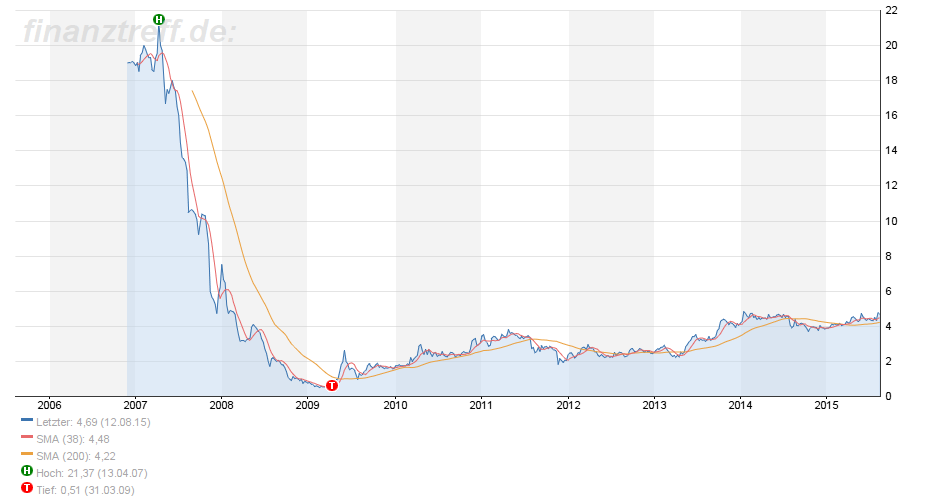 anhand des Charts über 10 Jahre möchte ich weitere alternative Denkweisen generieren...wir sehen, dass diese Aktie mal über 21 Euro wert war...ein Wert von 7,55 Euro pro Aktie erscheint also nicht übertrieben...an der Börse ist natürlich Alles möglich, jeder hat dort Seine eigenen Erfahrungen gemacht und sich vielleicht schon öfter im Leben gefragt "was soll das Ganze eigentlich"...jedoch zu denken "die Aktie ist 442 Euro wert"...naja, kann man natürlich auch machen...ich bin seit 20 Jahren an der Börse aktiv und habe schon so einiges erlebt, und mich auch schon gefragt "was soll das eigentlich Alles"... ;~) ja dann ich freue mich auf Alles was hier passiert und bedanke mich recht herzlich beim Verfasser dieses Forums, dass ich jetzt hier schreiben darf... ;~)
