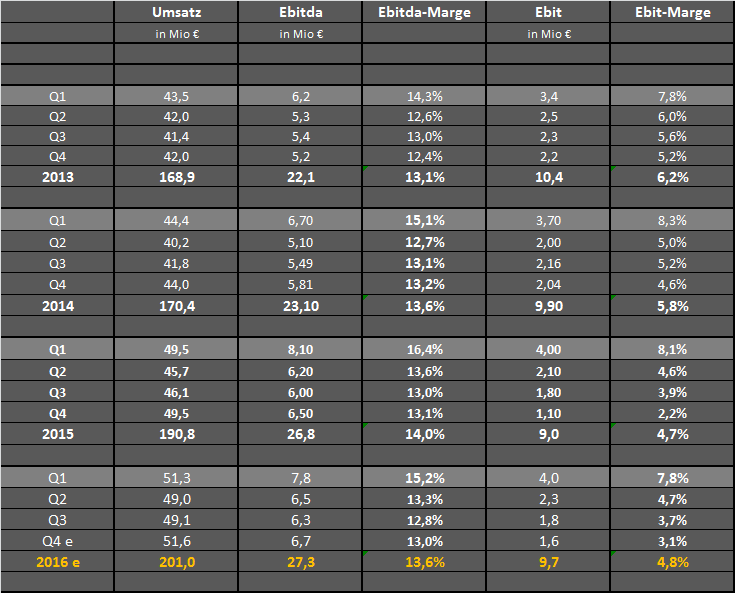 Rechne beim Ebitda mit ähnlichen Zahlen in Q1/17 wie in Q/16. Vielleicht gibts aber nochmal leichte Verbesserungen beim Zinsergebnis und Steuern. Entscheidend wird aus meiner Sicht das 2.Halbjahr für den Kurs, weil FP da große Hebel aufs EPS gegenüber 2016 hat. Leider sollen ja die Abschreibungen auch 2017 noch hoch bleiben. Da liegt aber die größte Fantasie für die nächsten Jahre, weil die Hebel extrem groß sind. Lass da mal von den derzeit fast 18 Mio Abschreibungen nur 1,5 Mio geringer ausfallen, dann springt das EPS gleich mal 6-8 Cents nach oben.
