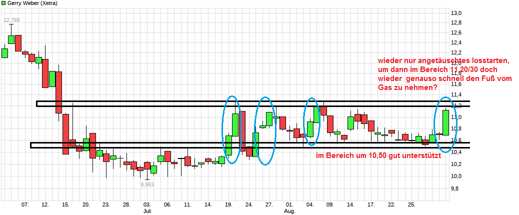 Im Bereich 11,20/30 wird nach raschen, newslosen Anstiegen dann nach 1-2 Tagen wieder der Hammer rausgeholt, um hier möglichst keine nachhaltige Kaufsignale zu erzeugen. Riecht wie gesagt etwas nach LV, die gewisse Eindeckungen in Salamiescheibenform vornehmen. Echte Investoren sind offenbar weiterhin nur mit der Lupe zu suchen.