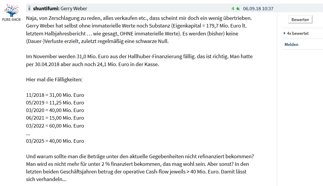 Es gibt genau 2 Posten in der Bilanz, die bei Gerry Weber werthaltig sind. Das sind die Barmittel von 20 Mio. und die Schulden von 356 Mio. Euro. Der Rest ist überbewertet und wird auch in der Zukunft, sofern Gerry Weber denn eine hat, weiter abgewertet werden. Für den Fortbestand gibt es m.E. nur eine Lösung und das wäre der (teilweise) Verzicht auf Forderungen durch die Gläubiger. Das wiederum wird dann mit einer Kapitalerhöhung verbunden, sodass der Aktionär davon nichts hat. Es werden nur Schulden in EK umgewandelt und die Überschuldung zu beseitigen.