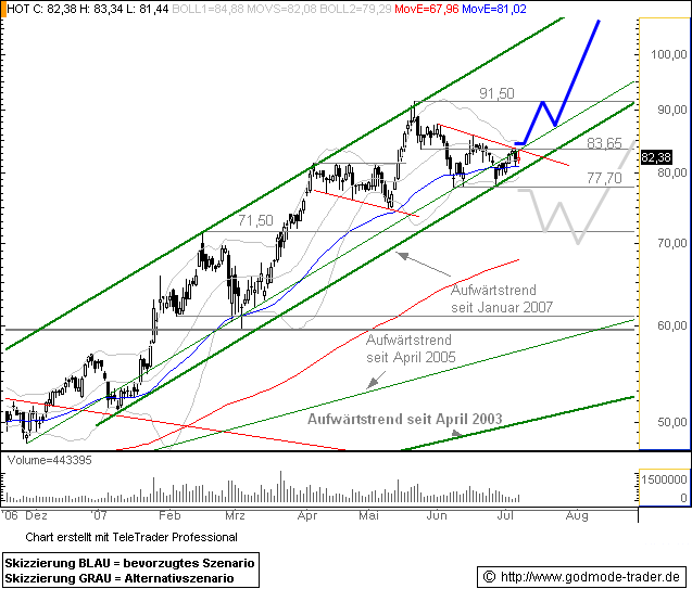 Rückblick: Die HOCHTIEF Aktie befindet sich in einer langfristigen Aufwärtsbewegung, welche sich seit November 2006 nochmals beschleunigt. Das Allzeithoch markierte sie schließlich im Mai 2007 bei 91,50 und korrigierte anschließend zurück bis in den Bereich der exp. GDL 50 (EMA50). Dabei bestätigte sie den Aufwärtstrendkanal seit Januar 2007 als dominierende charttechnische Sruktur. Dort tendiert sie leicht nach oben und erreicht den Kreuzwiderstand bei 83,65 Euro. Das sehr kurzfristige Chartbild ist neutral zu werten, das mittelfristige klar bullisch.