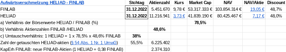 FINLAB bilanziert ihren 44,5%-anteil an HELIAD derzeit zum anteiligen, börsenkurs der HELIAD (s. oben v. 31.05.23 16:25: 44,5% x rd. 42mio per 31.12.2022), der seit jahren einen erheblichen discount zum inneren wert der HELIAD aufweist; nach einer verschmelzung mit HELIAD würde FINLAB stattdessen die einzelpositionen des HELIAD-portfolios zu 100% ihres angemessenenNAV ausweisen; in der fachsprache nennt man das die hebung stiller reserven, ich halte das für den eigentlichen clou der geplanten verschmelzung!