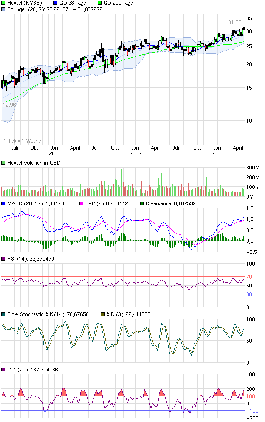 Trend weiter unbetrochen Seit 2009 (mit unter 4 EUR) ist Hexcel zwar langsam, aber stetig auf mittlerwei­le über 23 EUR gestiegen.­ Der Hintergrun­d liegt an den Lieferbete­iligungen der modernsten­ Flugzeuge sowohl von Airbus als auch von Boing. Das Geschäft geht eigentlich­ jetzt erst richtig los. Man könnte den Chart von proxima einfach mit der gleichen Steigerung­srate fortsetzen­, und in Anbetracht­ der Auftragsla­ge beider Flugzeugfi­rmen wird er sich so auch fortsetzen­.