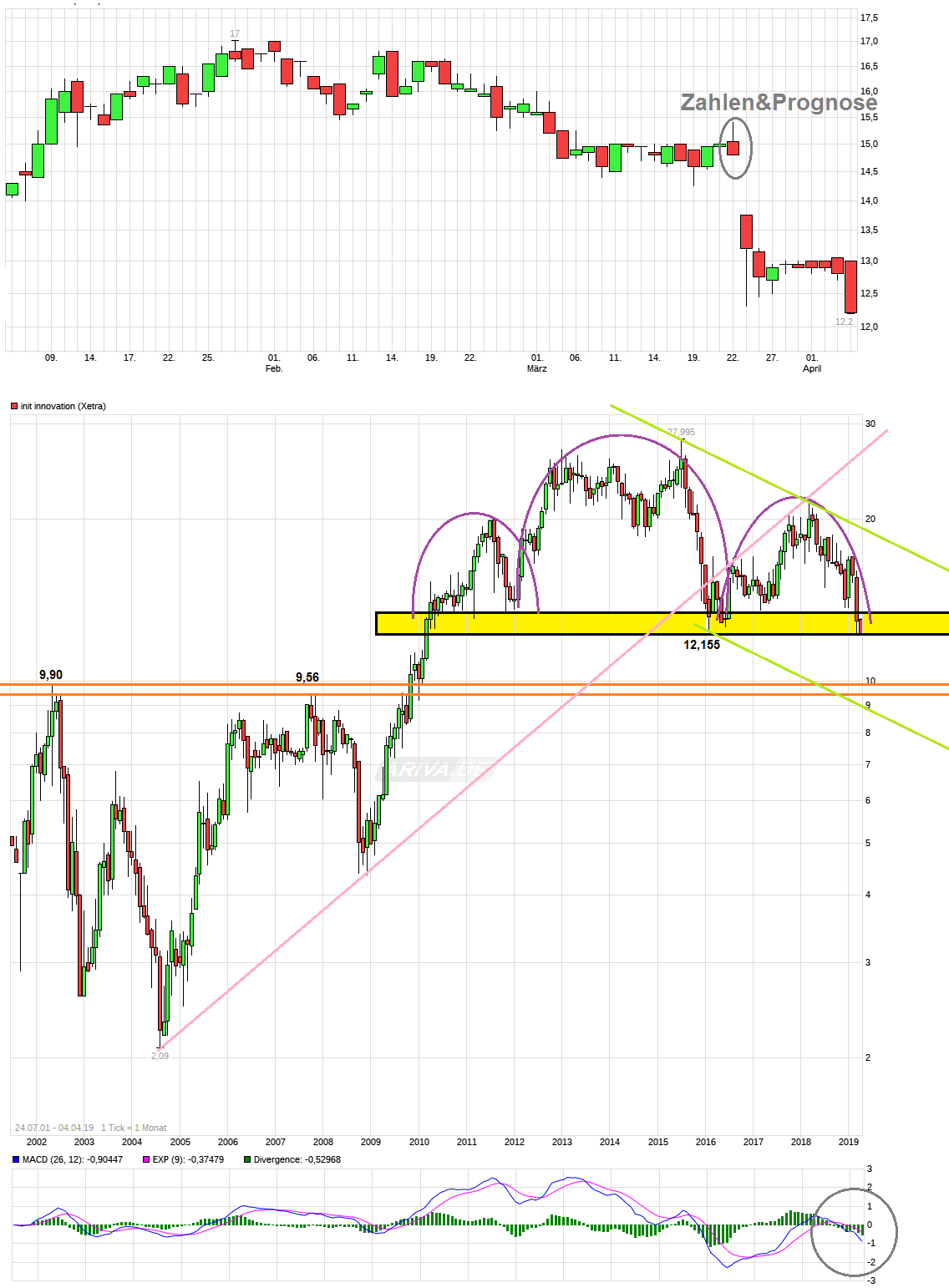 heute erreicht. Die Nachwirkungen der jüngsten stark enttäuschenden Aussichten zeigen weiter ihre Spuren und ein belastbarer Boden ist noch nicht zu sehen. Man ist heute bis auf ca. vier Cent an das Low von Anfang 2016 ( => 12,155 ) rangelaufen. Würde man die Marke nun auch noch nachhaltig unterschreiten, dann sähe die Bewegung der letzten Jahre wie eine große SKS aus und es wären weitere Kursrückgänge Richtung 9,50/10,00 zu befürchten. Von daher mal abwarten, ob noch Retter in der Not auftauchen und den Absacker verhindern.