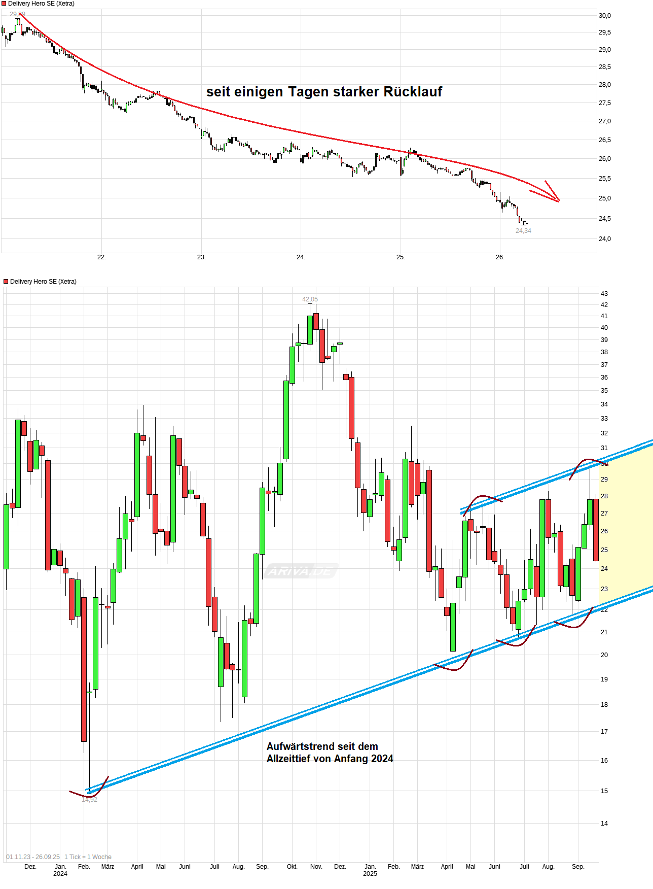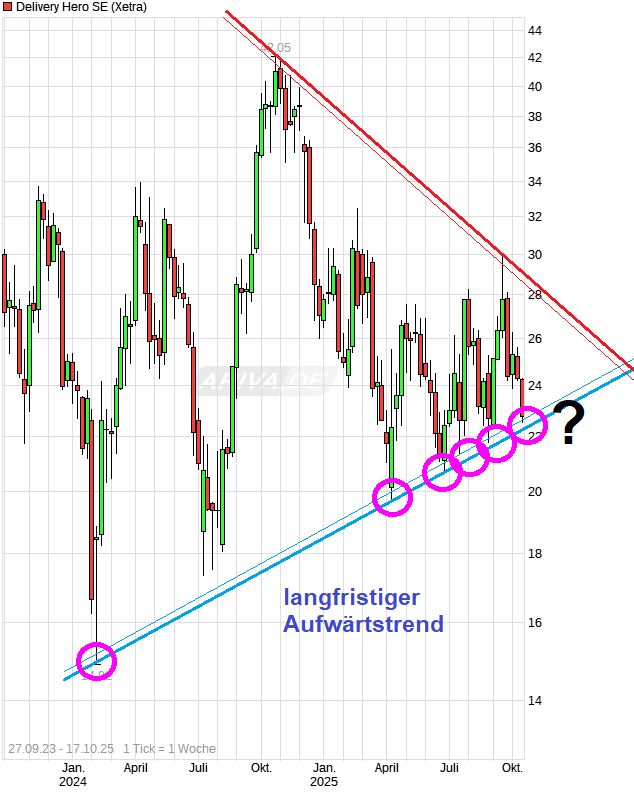 Das man nun die Jahresprognose für den Gewinn senken muß, ist auch zu einem guten Teil eigene Schuld. Schon im Frühjahr sind doch schon der US Dollar und der Korea Won deutlich schwächer geworden. Warum hat man also nicht da bereits viel vorsichtiger prognostiziert und schwache Währungstendenzen für das ganze Jahr antizipiert? Habe mir auch die Q&A Runde beim CC mal durchgelesen. Sind einige interessante Stellen dabei. Ein Statement ist, daß man bei Talabat zu den tief gefallenen Kursen erst einmal keine weiteren Anteile abgeben will. Die Frage ist nur wann die Talabat-Aktie überhaupt mal einen Boden findet. Seit dem IPO schaukelt man von Allzeit-Tief zu Allzeittief. Gesamtwert inzwischen deutlich unter 7 Mrd. Euro. DH hat noch immer 80% Anteil an Talabat und damit einen Substanzverlust im Milliardenhöhe seit dem IPO hier zu verzeichnen. Würde mal Talabat die Kurve deutlicher nach oben wieder bekommen, dann wäre es wohl auch für die DH Aktie leichter sich zu erheben.