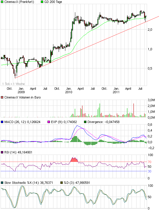 Diese Woche kommt Cars2 in die Kinos und nächste Woche dann die Schlümpfe und vor allem Super8. Von letzterem erwarte ich persönlich ne ganze Menge. Hoffentlich ist meine Begeisterung als Kinozuschauer nicht so groß, dass ich das Blockbusterpotenzial überschätze, aber ich glaub schon, dass der Film die 3 Mio Grenze überschreiten kann. Da HarryPotter ja auch noch guten Umsatz machen wird, dürften also auch die nächsten 2-3 Wochen gute Umsätze und Gewinne für Cinemaxx bringen. Nur der Finanzmarkt muss endlich mal aufwachen. Unglaublich eigentlich, dass Cinemaxx immernoch mit weniger als 100 Mio € bewertet wird. Angebracht wären eher 200 Mio €.