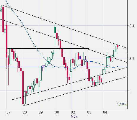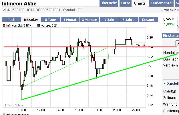 Die Mühe der Bullen war vergeblich: Bei der Infineon-Aktie ist am Donnerstag ein Ausbruchsversuch über die Widerstandszone bei 3,22/3,25 Euro misslungen. Nach einem Anstieg auf 3,27 Euro im Tagesverlauf schließt das Papier bei 3,20 Euro und damit unterhalb der charttechnischen Hürde, die sich mit dem heutigen Tag auf 3,27 Euro erhöht hat. Ein Anstieg hierüber hätte einige Prozentpunkte Kurspotenzial gegeben – so bleibt ein Minus von rund 2 Prozent und der vorletzte Rang in der Tagesliste der 30 DAX-notierten Titel – und möglicherweise eine neue Chance für den Freitagshandel angesichts der Tatsache, dass die Aktie nicht weit vom Kaufsignalpunkt entfernt ist.