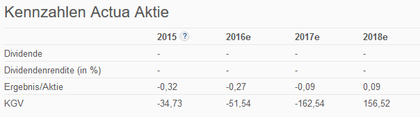 wird jetzt auf konventionellen Weg nochmal 50-100 Mill. in ARPs investieren, zumal das operative Geschäft 2017 keinen Cash mehr verbrennen wird. Die Börse nimmt dies wohl vorweg. Am Investmentcase ändert sich letztlich wenig. Fairer Wert liegt weiterhin bei 17-19$. Sollte Actua dann in den Folgejahren wie geplant um 15-20% wachsen und die Multiple stabil bleiben, entspricht die Wachstumsrate der zu erwartenden Rendite. Es bleibt ein solides Investment.