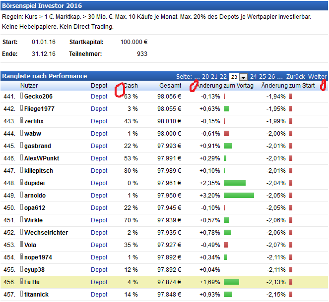 So könnte man die Tagesgewinner und Verlierer bzw. die mit dem meisten Cash oder dem wenigsten immer auf einen Blick sehen und muss nicht sämtliche Seiten einzeln durchklicken. Ein weiterer zusätzlicher Punkt den man in die Liste einfügen könnte wäre ja das Datum des letzten Trades. (dafür der letztere Ring)